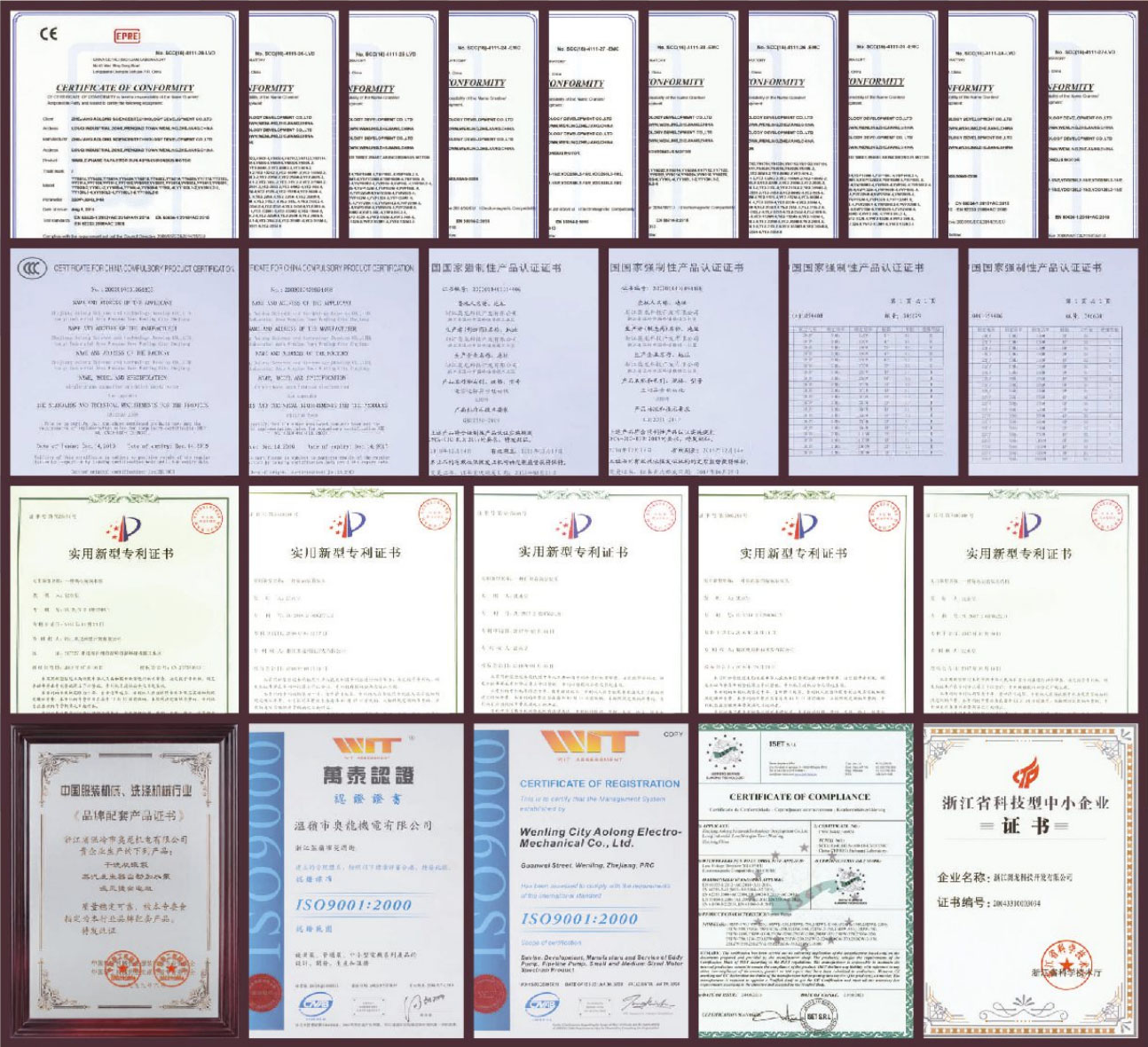公司先后获得多项专利,离心旋涡泵获国家发明专利,2004年被评为浙江省中小科技型企业,已通过3C和CE认证,具备了完善的管理体系和先进的生产检测设备,严格保证了产品质量。在国内电机和水泵行业中,奥龙被中国轻工机械协会指定为服装机械、洗涤机械行业品牌配套产品,已在锅炉、熨烫、水洗、干洗设备领域形成了专业化、系列化、标准化的配套产品,已达到国内同行中的领先水平。